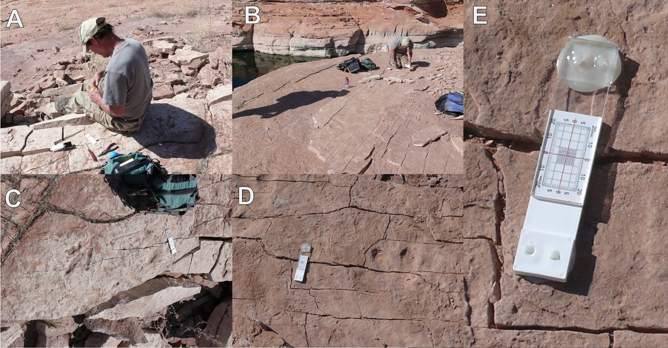 Figure 4. Installing crack monitors at site GLCA#3 in Glen Canyon National Recreation Area. A) Mixing epoxy, B) Installing crack monitor by Anomoepus tracks, C) Crack monitor by Anchisauripus tracks, D) Crack monitor by Anomoepus track, E) Close-up of crack monitor by Anomoepus track showing initial setting of 0,0.