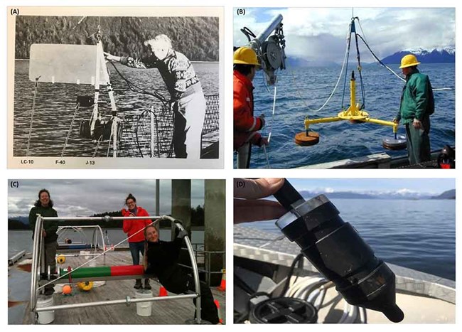 Malme and others (1982) first quantified Glacier Bay’s underwater soundscape using portable hydrophones (underwater microphones) deployed temporarily off the side of a boat (Figure 4a). Regular monitoring of ambient underwater sound began in 2000, when park scientists in collaboration with U.S. Navy acousticians installed a calibrated hydrophone near the mouth of Glacier Bay, connected by a 5-mile (8-km) cable to a custom computer system at park headquarters (Figure 4b). With this system, we created the first comprehensive description of sound sources (wind, rain, animals, and vessel engines), how often, and what their pitch and duration characteristics were (McKenna et al. 2017). We also used this system to make calibrated measurements of specific vessels that transited past the hydrophone at a known distance determined by GPS (Kipple and Gabriele 2004). Next, using autonomous recorders from Cornell University’s Bioacoustics Research Program in 2007, we broadened our efforts to listening mid-Glacier Bay to see if the sound characteristics were different there (Figure 4c).
