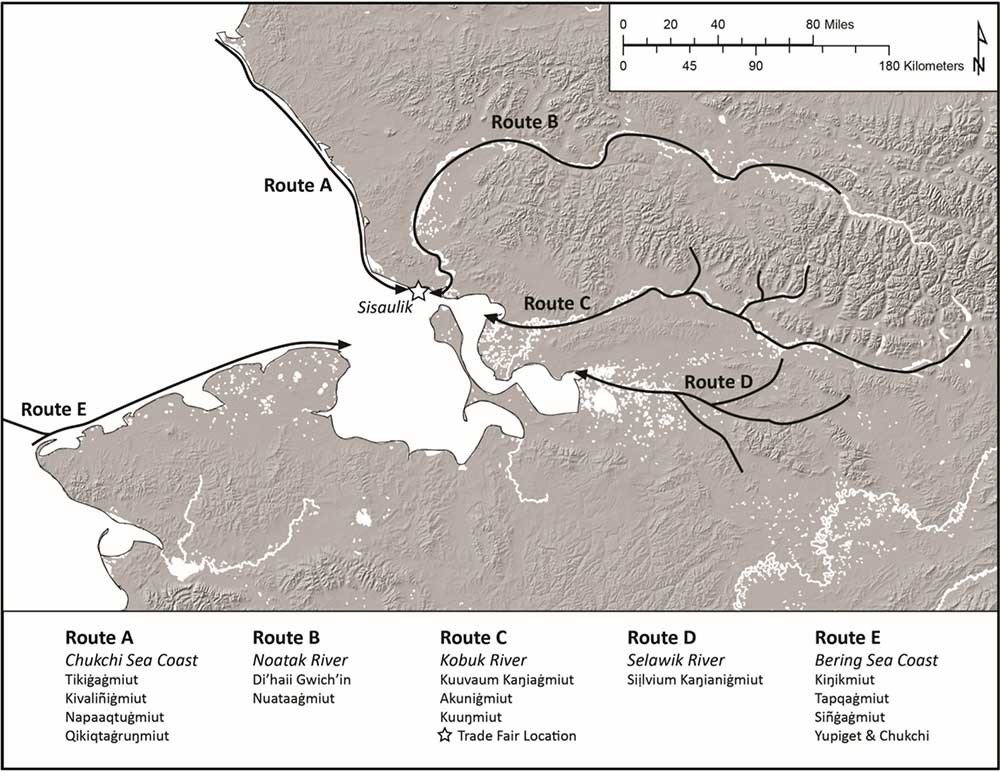 In the 18th century, the 15 Iñupiaq nations that inhabited Northwest Alaska and the Seward Peninsula incorporated the trade fair into their seasonal patterns of hunting and gathering. The fair drew in people from outside Northwest Alaska, including Chukchi and Siberian Yupik from across the Bering Strait, the Iñupiat of the North Slope, the Koyukon Athabascans, and Yup’ik traders from south of the Seward Peninsula. As many as 22 nations participated in some years, bringing up to 2,000 people through Sisualik for trade and celebration (Burch 2005). The trade fair usually took place from late June to August but was subject to the break-up of river and ocean ice, which often determined the seasonal harvest patterns of each group in attendance (Figure 2).