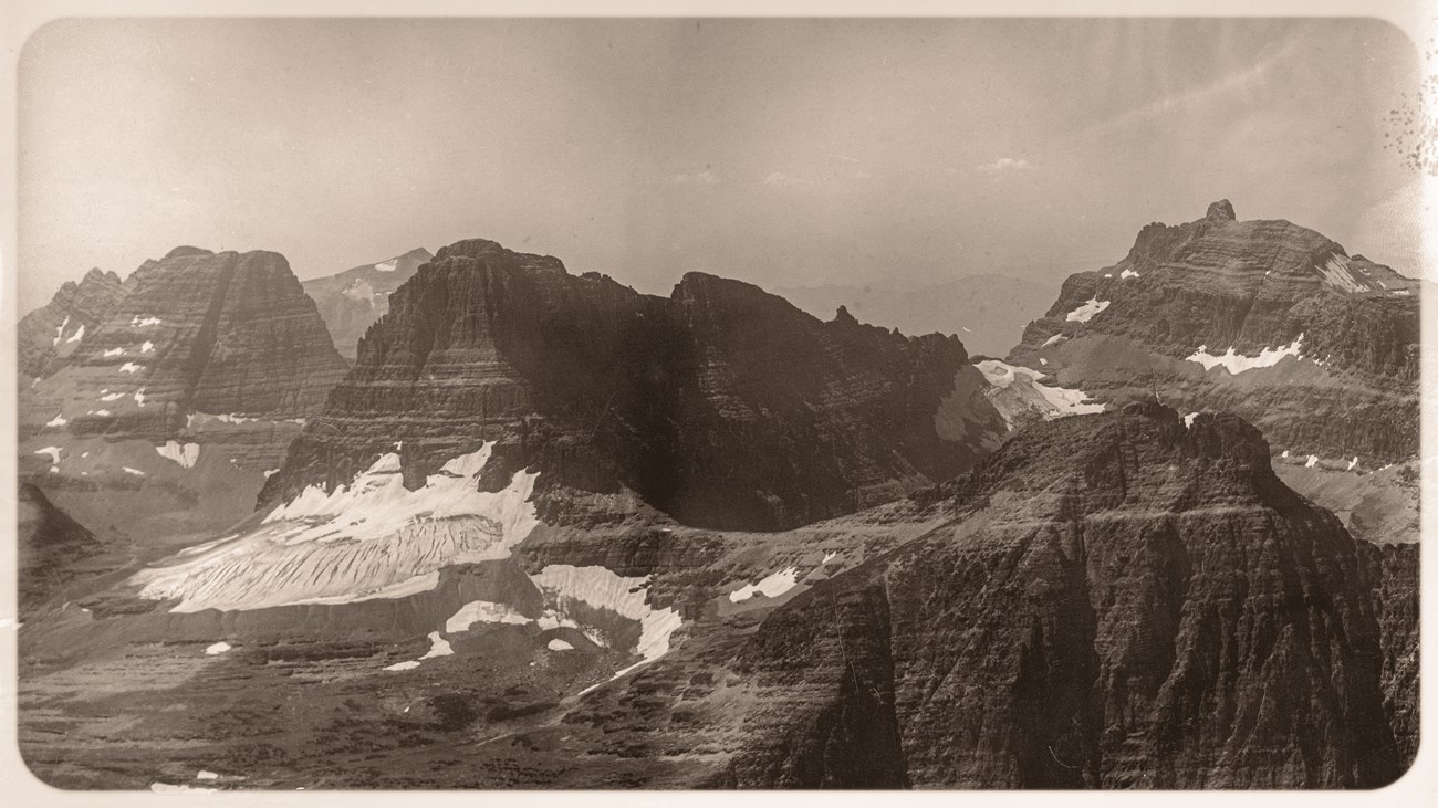 The onset of a warming trend at the end of the 1800s melted many of this area’s smaller glaciers. Clements Glacier, shown here in 1914, was located near the modern-day trail to Hidden Lake Overlook.