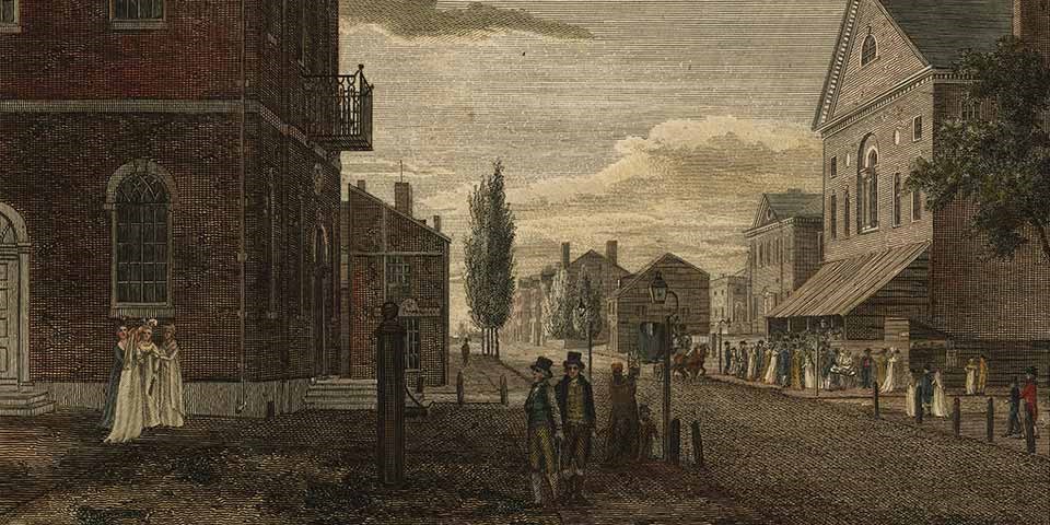 Detail, Congress Hall and New Theatre, in Chestnut Street, Philadelphia. By William Birch, 1800. New York Public Library Digital Collections, https://digitalcollections.nypl.org/items/510d47da-3100-a3d9-e040-e00a18064a99