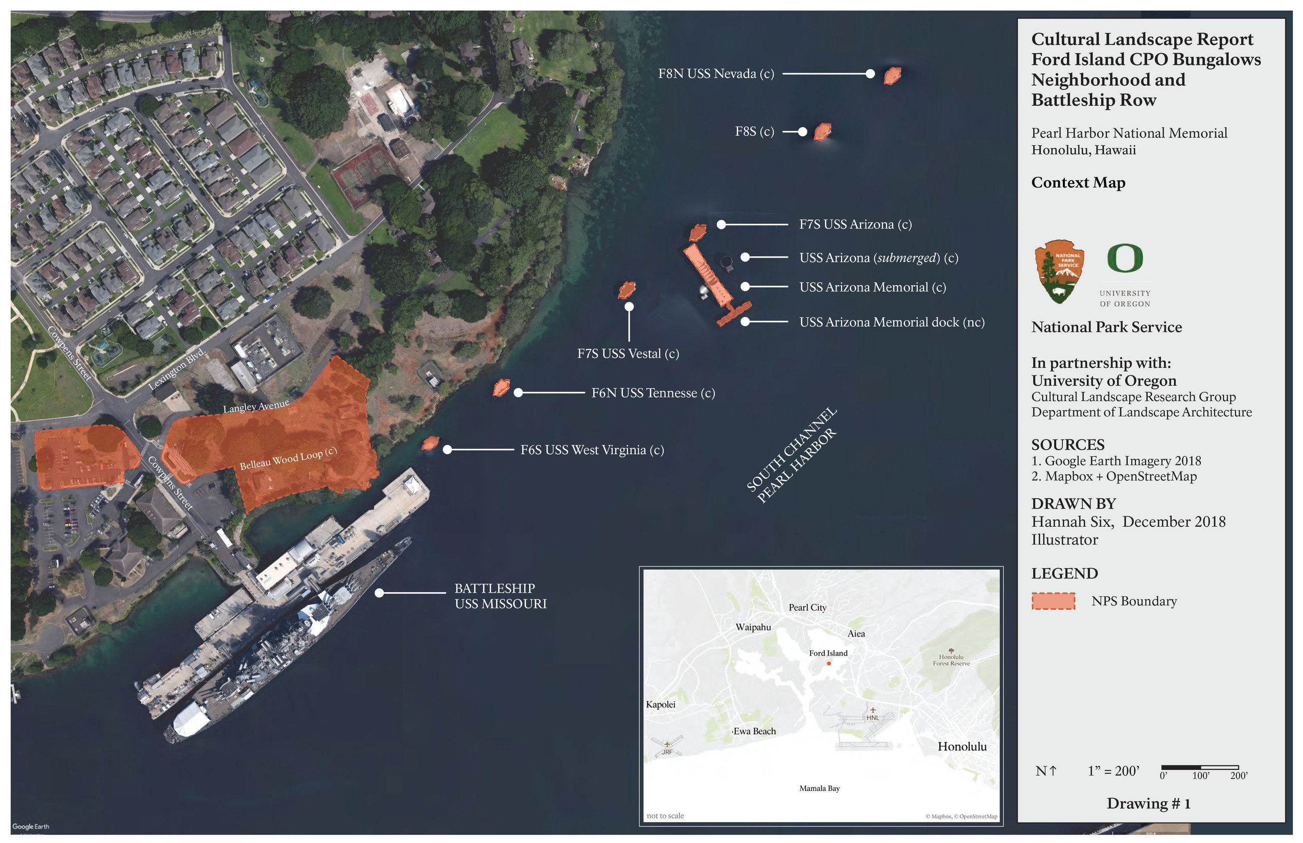 The Ford Island CPO (Chief Petty Officer's) Bungalows Neighborhood and Battleship Row is a part of Pearl Harbor National Memorial, which is located within Joint Base Pearl Harbor-Hickam on the island of O’ahu in Hawai’i.