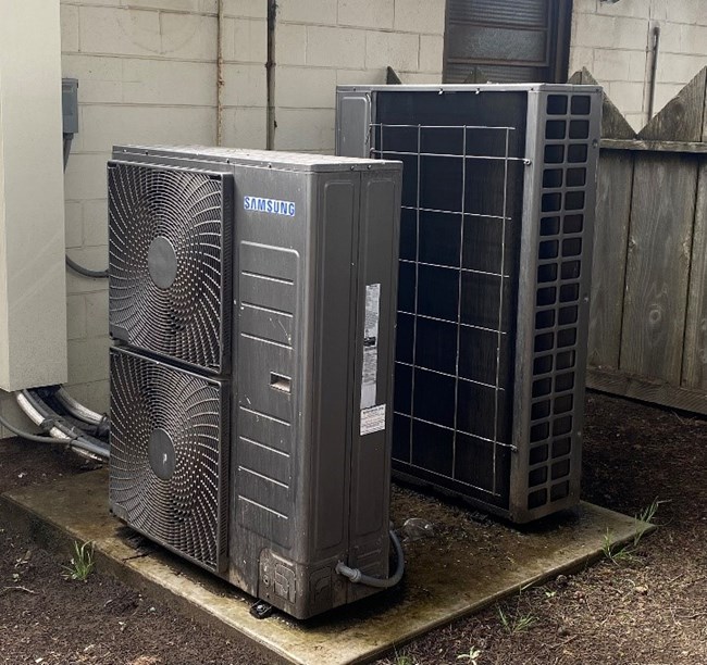 At Fort Funston, two heat pumps have been installed outside the buildings they will be serving. Larger Building 101, intended for both NPS and Golden Gate National Parks Conservancy staff, is being heated and cooled by a large heat pump. The DVM S Eco Heat Recovery unit can support up to ten indoor units and its newer design allows for less noise when in operation. The smaller of the two units is connected to the adjacent residence intended for park staff housing.