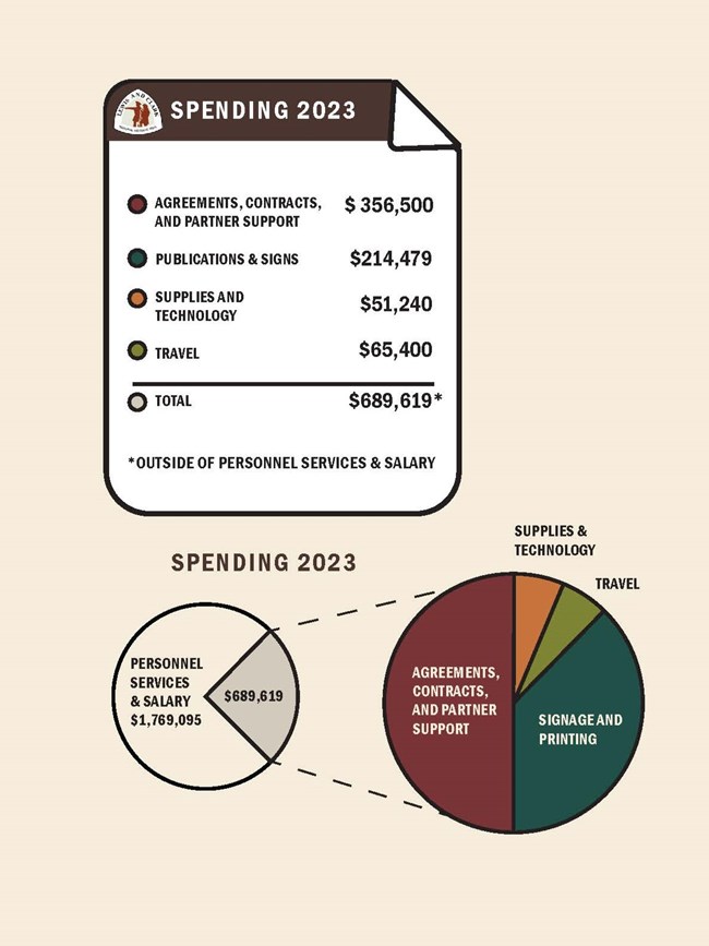 Piechart (left) illustrates that, outside of Personnel Services and Salary, Agreements, Contracts, and Partner Support make up about half of spending. Publications and Signs represent a little more than half of spending, with Supplies and Tech and Grant Projects making up the rest.