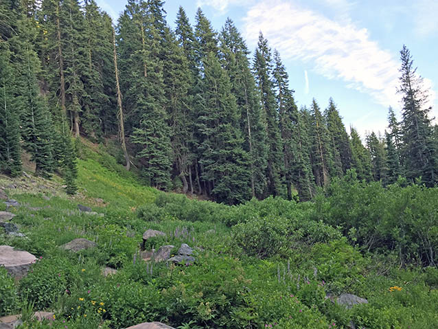 Castle Crest meadow is enclosed by a mature forest. The trail skirts the edge of the meadow. (June 2015)