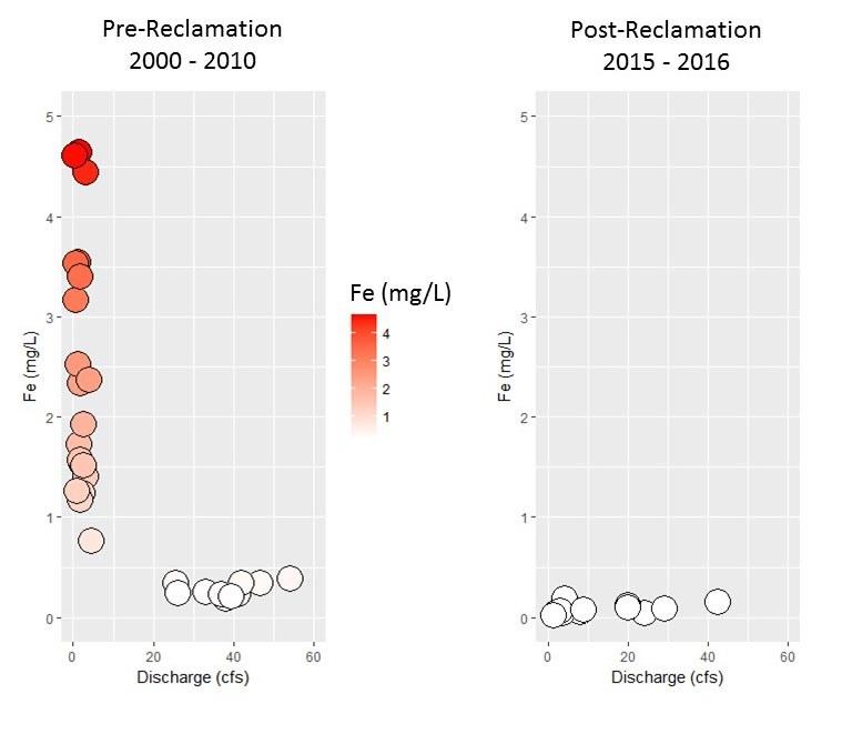 Samples that meet the MTDEQ iron standard are shown in white; those that exceed the standard are shown in shades of red. The window of reclamation extended from summer of 2010 to fall of 2014.