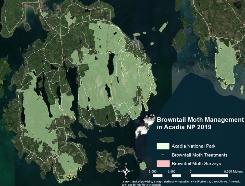 After one web was confirmed in on a serviceberry on the Great Head Trail in 2019, Acadia staff surveyed high visitor use areas in the park, including picnic areas, parking lots and some popular trails. Resource management staff clipped and treated 141 webs from trees and shrubs among 29 different sites in the park (Fig. 2). So far in 2020, managers have removed slightly more webs than 2019 and have found more sites containing browntail moth. Still, the densities of webs in most areas are low enough that severe health issues are not likely. Most of the webs were attached to serviceberry, apple, white birch, choke cherry and red oak. Be on the lookout anywhere in Hancock County as browntail moths can spread to new areas on their own, with the wind, and as pupae attached to vehicles.
