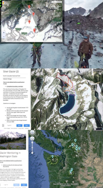 Figure 1: Scenes from the Glacier Monitoring in Washington State virtual field environment. The environment employs Google Tour Builder (a Google Earth derivative) to access and display panoramic glacier “tours” and geospatial and other data produced in cooperation with USNPS glacier- monitoring teams. Access to the environment prototype provided on request by frank Granshaw (fgransha@pdx.edu).