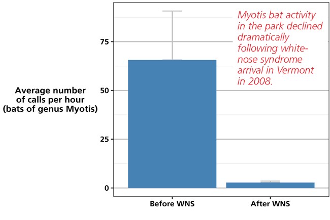 Activity of bats in the genus Myotis has declined dramatically in the park. Bats in this genus are sensitive to white-nose syndrome.