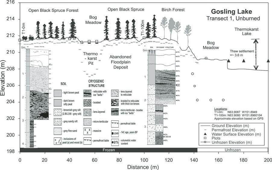 A monitoring transect established near Gosling Lake in northwest Denali National Park (Fig. 6) shows that it has ice-rich, abandoned floodplain deposits that are undergoing widespread thermokarst, resulting in extensive development of thermokarst lakes and bogs. The initial surveys of ground and water surface elevations have established the baseline conditions for thawing along the edge of the thermokarst lake and for the beginning stages of a bog. A floating shore bog surrounds the margin of the lake, and the surface stays slightly above the level of the lake water. Water in the bog, however, is confined by the permafrost and remains isolated from groundwater conditions. Active-layer depths above the permafrost mostly vary between 40 and 60 cm along stable portions of the transect, but probing in the bog indicates that permafrost has thawed up to 4 m below the surface, and a talik (perennially thawed zone) has developed above the permafrost. As a result of thawing, the ground surface is now 0.5 m below the original ground surface elevation, although a floating mat of Sphagnum mosses covers the bog and masks the original ground surface. Permafrost is absent at the margin of the thermokarst lake. Probing revealed the presence of a thaw bulb underneath the adjacent shoreline. Also of interest is the shallow depression 40 m back from the lake edge, formed as a result of the thin-surface permafrost layer above the thaw bulb that has cracked and settled above the thawing subsurface material. A repeat survey of the transect in 5–10 years will provide data for quantifying the rate of subsurface thawing and lateral expansion of the thaw lake and bog.