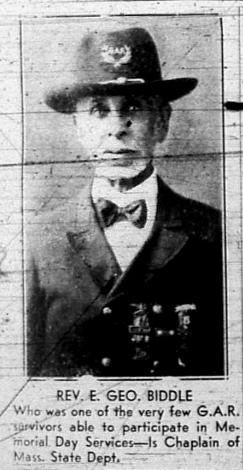 Reverend Dr. E. George Biddle (94), the last remaining member of the Robert A. Bell Post, 134, served as "the guest of honor at impressive exercises in honor of the 54th Massachusetts Infantry" at the 1939 Memorial Day exercises, becoming the last member to do so.[26]