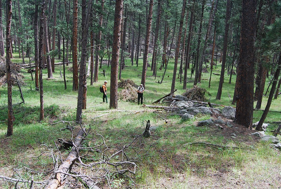 Post-treatment monitoring plot within the restoration unit at Mount Rushmore National Memorial. Pole-sized tree density was reduced by more than 95%.