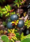 With nearly 50 species of wild berries in Alaska, the fall season is a time of great abundance in the Seward Peninsula. From around July until the first frost, locals and subsistence gatherers scatter throughout the slope tundra to collect gallons of these low-growing ripe fruit. Visitors should be aware that while most berries on the Seward Peninsula are edible, there are some poisonous species in Alaska. Make sure you know the identity of a plant before you eat it! If you're careful, hiking in Bering Land Bridge in the fall can be a deliciously rewarding experience. NPS Photo / Matt Jenkins Suġaq / Bog Blueberry(Vaccinium uliginosum) One of many blueberry varieties on the Seward Peninsula, the Bog Blueberry blooms from late-May through June. The tart fruit can be harvested from about July through August. It grows best in bogs, tundra, and alpine slope habitats.