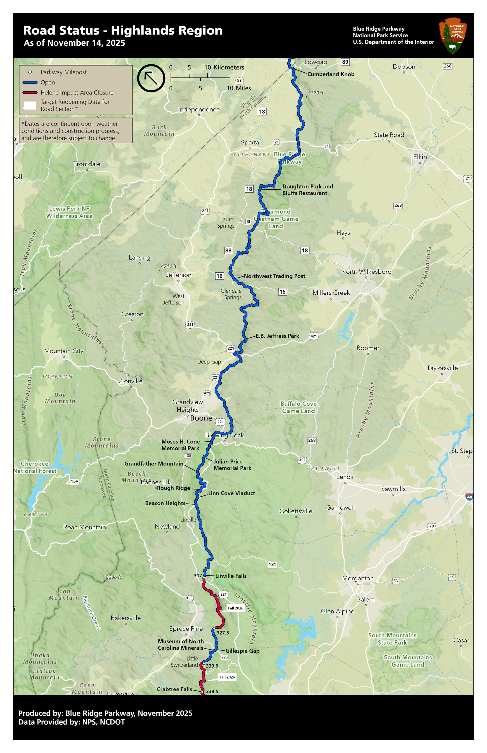 Road Closure InformationIt is important to know if the parkway is open before you visit, especially between November and March. Be sure to check the status of the motor road on our Road Status and Closure page. Official Parkway MapsTo download official maps in PDF, Illustrator, or Photoshop file formats, visit the National Park Service cartography site, or pick up a copy at any of our visitor centers.Below: Toggle between two maps with different features, Park Tiles or Brochure Map, using the picklist on the top left corner of the map. Visit the Alerts and Conditions page for a full list of open and closed sections.