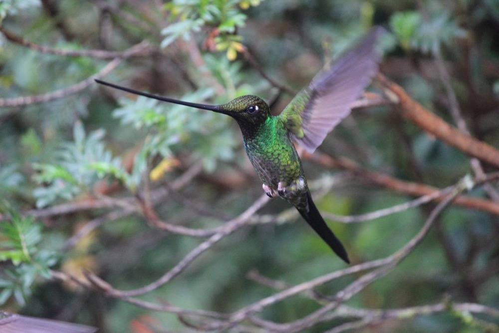 Photo courtesy of iNaturalist.org, user nikitacoppisetti – The aptly-named Sword-billed Hummingbird.For all of their differences, hummingbirds share some fascinating things in common. One of the most incredible characteristics of hummingbirds is how they fly. Hummingbirds are the only type of birds that can truly hover. Don’t let that raptor fool you – hawks, eagles, or vultures are only using air currents to make it appear that they’re hovering. Hummingbirds, on the other hand, do not require air currents as they hover by wing power alone. They can achieve this feat because of how their wings move. Hummingbirds do not move their wings in a linear forward-and-backward fashion as other birds do but, rather, in a figure eight. This advanced design allows the bird to hover and move in any direction, including backwards!