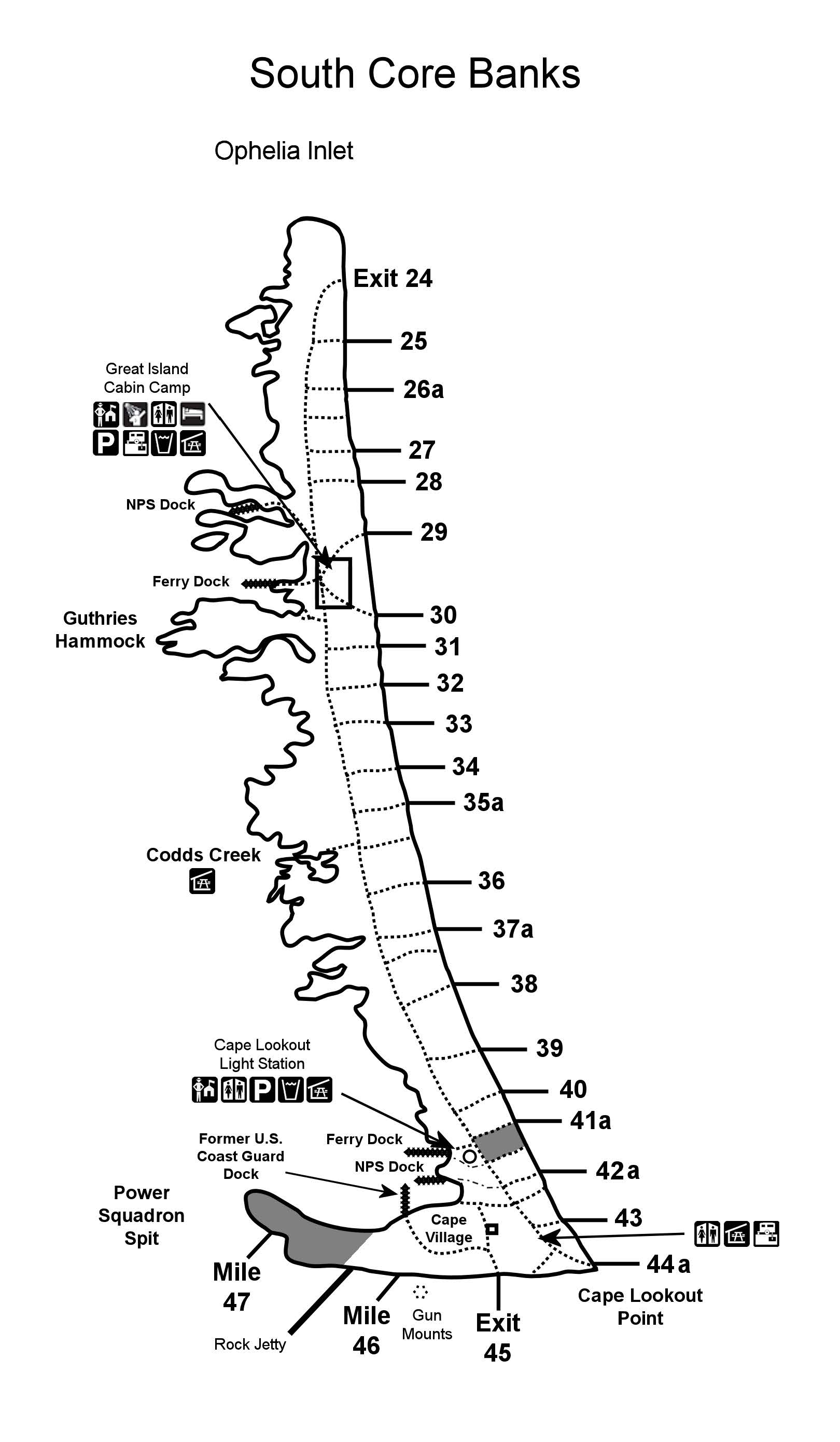 Driving Map: North Core Banks (jpg, 195 Kb) Use this North Core Banks driving map to find exit ramps off the "back road" for the former Long Point Cabin Camp (Long Point Cabin Camp is closed due to heavy damage inflicted by Hurricane Dorian in 2019), Portsmouth Village, (Portsmouth Village is now cut off from the rest of the barrier island by Evergreen Inlet at about mile 3 on North Core Banks. Evergreen Inlet was formed by Hurricane Dorian in 2019.) and other areas