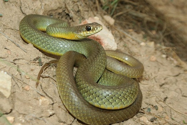 NPS / Great Falls Park Milksnake (Lampropeltis gentilis)NonvenomousThis is a wide-ranging snake, common across the United States. Because of this, there are many subspecies of milksnake. The one found here is the Utah milksnake (Lampropeltis gentilis taylori). Milksnakes in this area can be similar in appearance to the Great Plains ratsnake, but they typically have more vibrant coloring. The body is pale, gray, or light brown, with darker bands of red, orange, or brown bordered in black. While ratsnakes tend to have a more discernable head with a skinny neck, milksnakes generally have short, thick necks about the same width as the head. Adults are usually between 15 to 33 inches (39 to 85 cm) long. Bizarrely, the name comes from an old folk belief that these snakes could milk cows. NPS / Cindy McIntyre Striped Whipsnake (Coluber taeniatus)NonvenomousPreferring canyon, sagebrush, and pinyon-juniper woodland habitats, whipsnakes are right at home in Dinosaur National Monument. Named for their whip-like appearance, these snakes are usually tan, brown, or black, with paler stripes running the length of their bodies. The tip of the tail is often pinkish in color. Adults are large, capable of growing up to 5 feet (1.5 m) long. They are also whip-fast and hard to spot because their stripes serve to break up their appearance as they move. Whipsnakes can be aggressive. Even though they aren't venomous, most will not hesitate to bite if they feel threatened. NPS / Dan Johnson Gopher Snake (Pituophis catenifer)NonvenomousGopher snakes are large constrictors, typically between 4 and 8 feet (1.2 to 2.4 m) in length. They are yellow or tan in color, with black or dark brown blotches that are square or "saddle" shaped on the spine. Although gopher snakes are known to eat rattlesnakes, when threatened, they will mimic rattlesnake behavior by coiling into a strike posture, flattening their heads, and shaking their tails (even though they don't have a rattle). They do this in hopes of scaring away their attackers. Another popular name is "bull snake." While the names are often used interchangably, true bull snakes (Pituophis catenifer sayi) are actually a subspecies of gopher snake more common in the central United States. The subspecies in this area is the Great Basin gopher snake (Pituophis catenifer deserticola). NPS / Dan Johnson Terrestrial Garter Snake (Thamnophis elegans)Weakly venomous, but non-lethalWhile western terrestrial garter snakes do posess a mild venom in their saliva, it's not potent enough to harm humans (or anything much larger than a mouse). They have no fangs either, so bites rarely result in anything more than mild irritation. Like other species of garter snake, western terrestrial garter snakes are beneficial contributors to the ecosystem. They prefer riparian (wetland) habitats, where they hunt rodents, slugs, leeches, amphibian larvae, and small fish. They are usually greenish or tan in color with pale stripes running down the sides and the top of the back. They often have reddish, brown, or black spots between the stripes. They can grow up to 41 inches (104 cm) long. Highly Venomous SnakesThese venomous snakes are native to Dinosaur National Monument. They are important members of the ecosystem, protected by federal law. They won't bite unless they feel threatened, so leave them alone. Don't try to harm or kill them, or you could face charges. If you are bitten, leave the snake alone and call 911 immediately!Midget-faded Rattlesnake (Crotalus oreganus concolor) Prairie Rattlesnake (Crotalus viridis) NPS / Dinosaur National Monument Midget-faded Rattlesnake (Crotalus oreganus concolor)VenomousThis is a smaller subspecies of the western rattlesnake. While they can grow up to 2.5 feet (75 cm) long, most adults are only about 1.5 feet (45 cm) in length. Don't let the size fool you, though. This snake possesses one of the most lethal venoms of any snake in the United States. This is due to an element called "concolor toxin," which affects the nervous system. Unlike other rattlers, the midget-faded rattlesnake's venom does not drop in toxicity as the snake reaches adulthood. Fortunately, they're unlikely to bite if left alone. Don't turn over rocks or logs where snakes may be resting. Give them plenty of space.