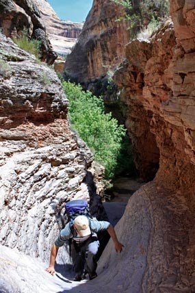 A hiker climbs some of the rocky slopes in Lower Sand Canyon.