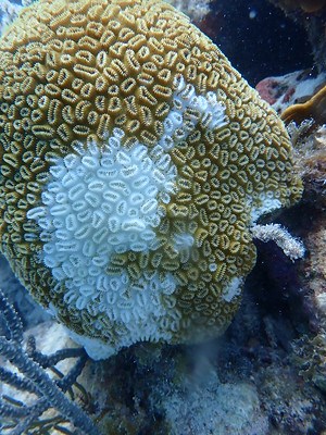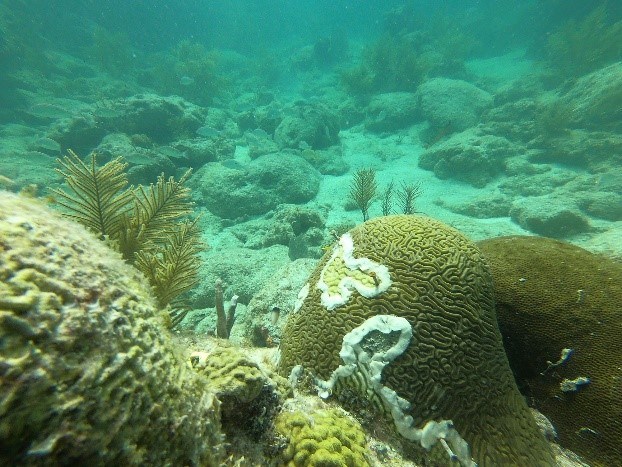 NPS Photo by Melissa Heres What is Stony Coral Tissue Loss Disease?Scientists named this disease "Stony Coral Tissue Loss Disease" because it only affects stony corals, otherwise known as hard corals. It is an infectious, water-borne disease that causes tissue death in hard coral species and has the potential to damage entire reefs. While the cause of the disease is yet unknown, bacteria likely plays a role. The disease is a major threat to corals because many colonies are affected at each site (high prevalence), it’s very infectious (high rate of disease transmission), and there is high mortality associated with infection. This is the first coral disease outbreak to follow an infectious disease model.What does it look like?Tissue loss rapidly progresses as an irregular white band or line from the base of the coral colony to the outer edges, or as a series of irregular blotches that spread outward and often join together. Mortality rates are highly dependent on species. Even large colonies of highly susceptible species can be completely killed in months. See image above.Where is the disease found?First reported in 2014 near Virginia off the coast of Miami, Stony Coral Tissue Loss Disease is now found throughout Florida’s Coral Reef. The disease has also spread to coral reefs around the Caribbean including Jamaica, Mexico, St. Maarten, the US Virgin Islands, and the Dominican Republic.