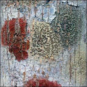 Close-up view of lichens growing on a weatherworn dead buttonwood snag.