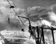 | Left: The tanker Tidewater battles through the seas off Cape Hatteras in 1940. No matter how strong