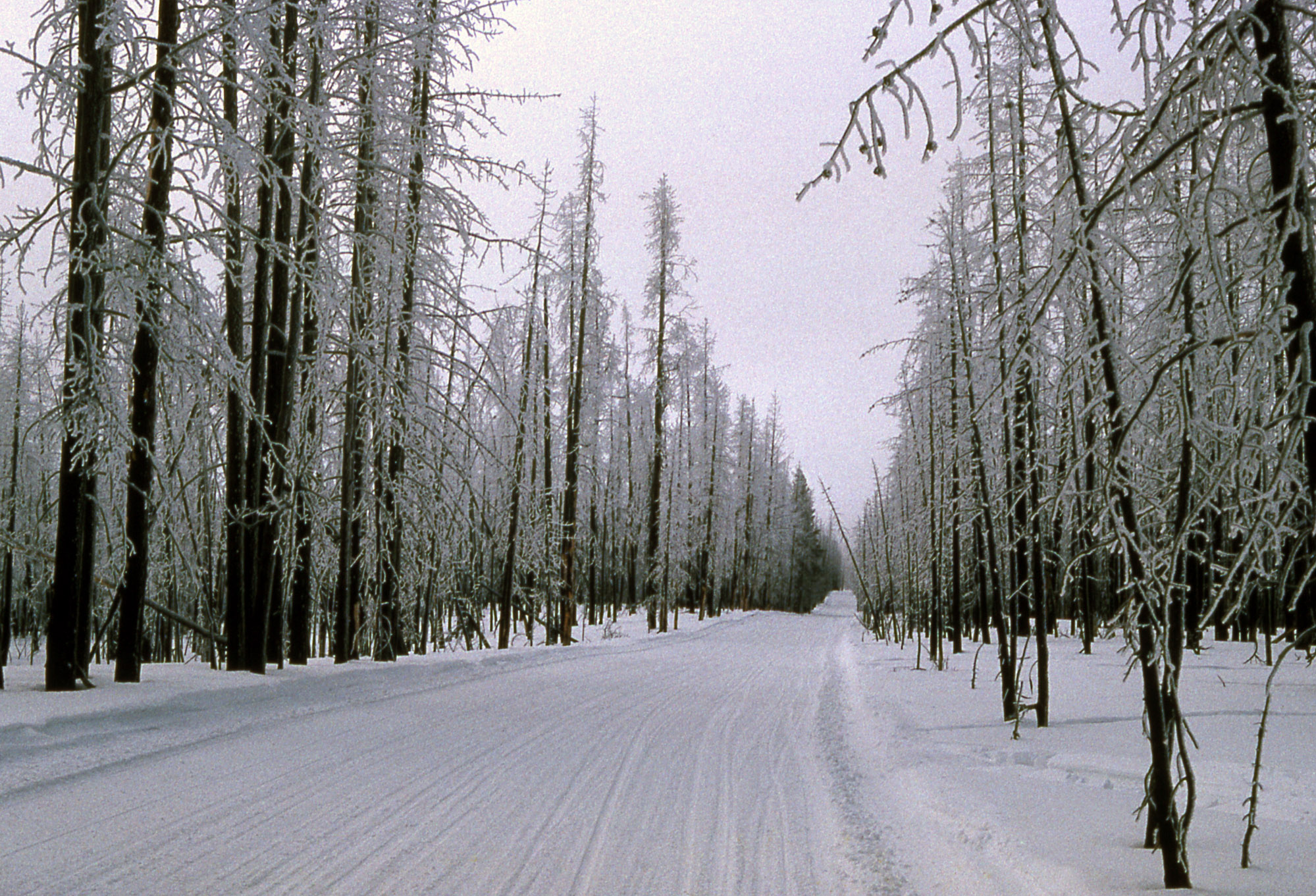 West Yellowstone road snow packed by winter travel;