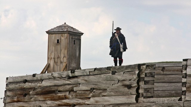 A man in a heavy wool jacket stands with his musket near a sentry box on the fort wall.