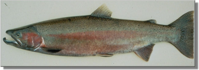 Photo: Fisheries and Oceans Canada Abundance, distribution, and natural historyOnly 16 records exist for this species with many observers reporting only species presence. Coastal rainbow and steelhead trout are known from only 8 different stream systems throughout the park but undoubtedly occur within many more. Adult fish have been reported in streams from April through September. Although few fish have been reported, returning steelhead spawning adults are likely most abundant in May. Those reported in April through June likely represent the anadromous steelhead form while fish reported in August and September likely represent resident type fish. Reports of steelhead and resident rainbow trout are often suspect because of the difficulty of discriminating coastal rainbow trout from cutthroat trout. Cutthroat in this area are often mistaken for rainbow trout because they do not consistently display the orange slash marks under the jaw. Steelhead typically spend two to three years in freshwater before migrating to sea. They return to their natal waters one to three years later to spawn. Unlike Pacific salmon, steelhead may survive after spawning to spawn in subsequent years after time in salt water. Repeat spawning steelhead typically comprise a small component (10-20%) of spawning populations.