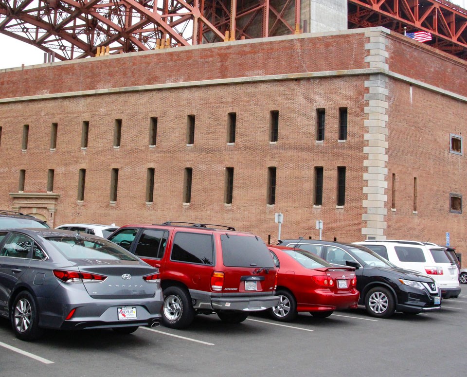 Joseph Strauss, the Chief Engineer for the Golden Gate Bridge, project initially wanted to raze the fort because it's location was ideal for the bridge's San Francisco anchorage. But after visiting the fort and admiring it as "a fine example of the mason's art," he adjusted his calculations, moved the anchorage several hundred feet south, and added a "bridge within the bridge" to support the total length over the fort. Note the seawall and flume in the historic photo. Completed in 1870, a 1,500 foot granite seawall was constructed to protect the foundations of the newly built fort from the relentless pounding of Pacific Ocean waves. The flume was built to carry water from nearby Lobos Creek around the point to fill the Russian Hill reservoirs to supply the growing population of San Francisco.