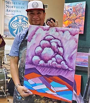 His work captures the daylight and nightscapes colors and shadows of the Navajo Nation and of the Southwest. Jerrel paints scenes that are recognizable as desert, sky, and clouds but are represented in an abstract fashion.