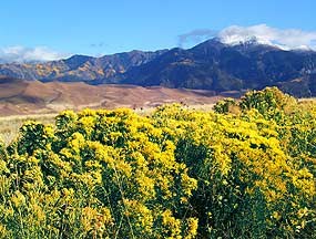 Rubber rabbitbrush is the most common shrub of the park's grasslands. In September, it flowers out to match the golden aspens on the mountains.