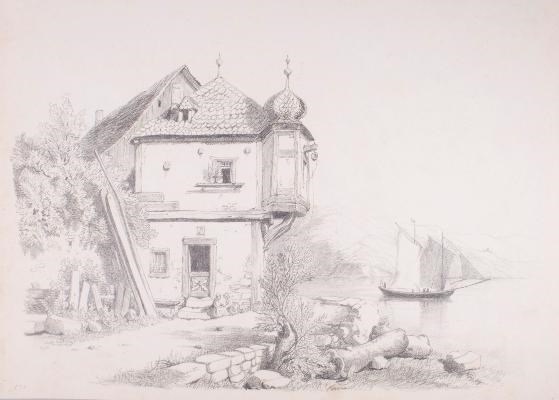 Watercolor on paper of landscape, c.1885 (HAMP 4443) (right) NPS A number of scenes showing informal views of the countryside around Hampton survived from Helen’s albums of artwork. The landscape on the left may show the back side of a historic mill, possibly near the Hampton estate. |