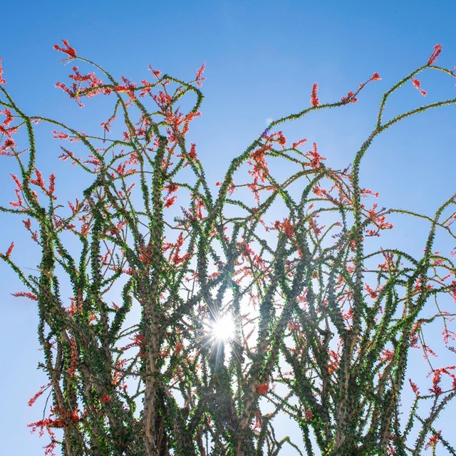 • Red flowers grow atop spindly green stems of an ocotillo against a blue sky