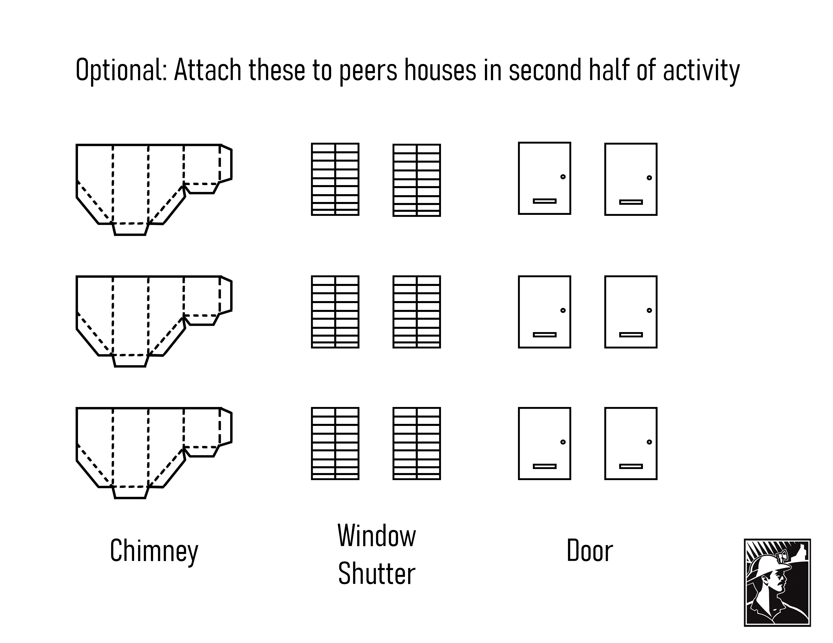 After each group has a completed building, they will pass their buildings around to one or many other groups who will then change or alter the house in some way. They can alter the houses by coloring on them or pasting the provided extra windows, doors, or chimneys.