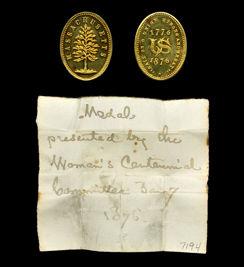 In January 1876 Henry W. Longfellow received the medal pictured above and wrapped it in a small piece of paper upon which he wrote “Medal presented by the Women’s Centennial Committee Jan.7 1876.” Measuring only one inch high and less than an inch across, it is a gold-plated oval with a pine tree and “MASSACHUSETTS” on the obverse, and lettering on the reverse that reads “1776 US 1876” surrounded by “SAIL ON O UNION STRONG AND GREAT”, a line taken from Longfellow’s 1849 poetic assertion of faith in the Union, “The Building of the Ship”.