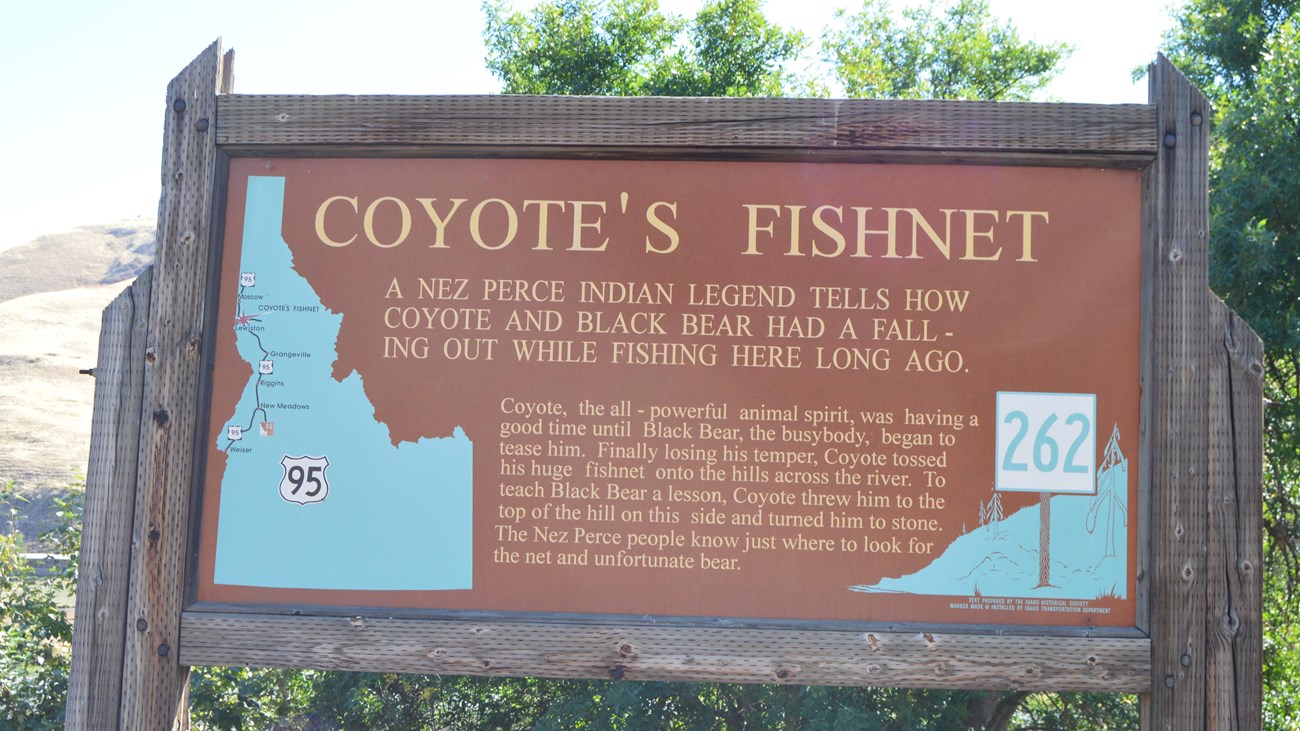 NPS photo In autumn, the people go to buffalo country to get food for the winter. Coyote (known as Iceye'ye to the nimíipuu) had forgotten about this annual trip and was in the Clearwater River fishing for salmon. Black Bear came upon Iceye'ye fishing and asked why he was still in the area instead of heading to buffalo country. Iceye'ye did not want to admit that he had forgotten to leave with everyone else, so he got angry at Black Bear for being nosy. In his anger, Iceye'ye flung his fishnet up onto the hill on the south side of the Clearwater River and grabbed Black Bear by the scruff of his neck. He then yelled at Black Bear for interrupting him and threw him onto the hill on the north side of the river. Iceye'ye then left for buffalo country.