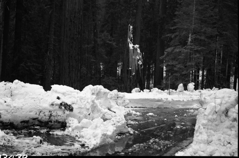 Robert Zink, 690502, Lost Grove, KCNP, Record Heavy Snows, Fallen Giant Sequoias, Fallen sequoia in Lost Grove, fell during February snows, made a good trench in pavement, broke into many pieces.