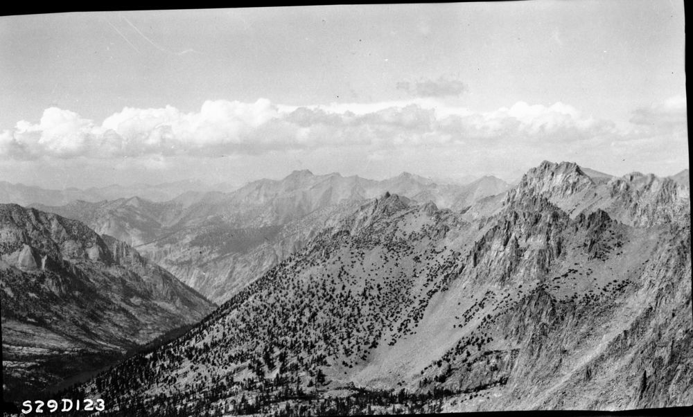 Trail routes, looking northwest down East Creek Canyon, from the Kings-Kern Pass (12,330') into the National Forest. Approximately 4 miles airline to John Muir Trail. Glaciated Canyons, Misc. Canyons