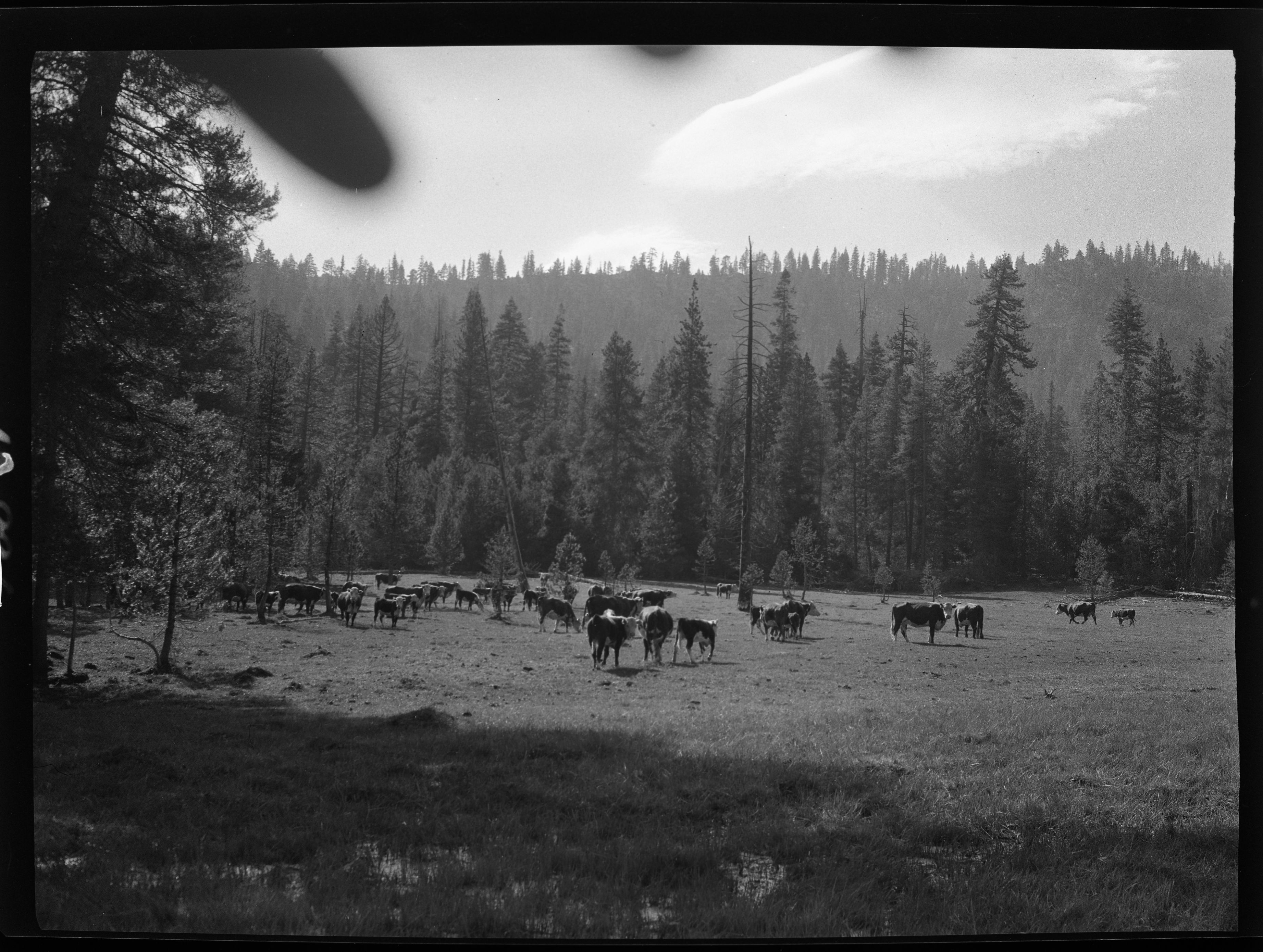 Lowell Sumner, 490803, Sugarloaf Meadow, KCNP, Meadow studies, grazing, a few of the cattle that keep the grass mowed all summer closer than a lawn mower.