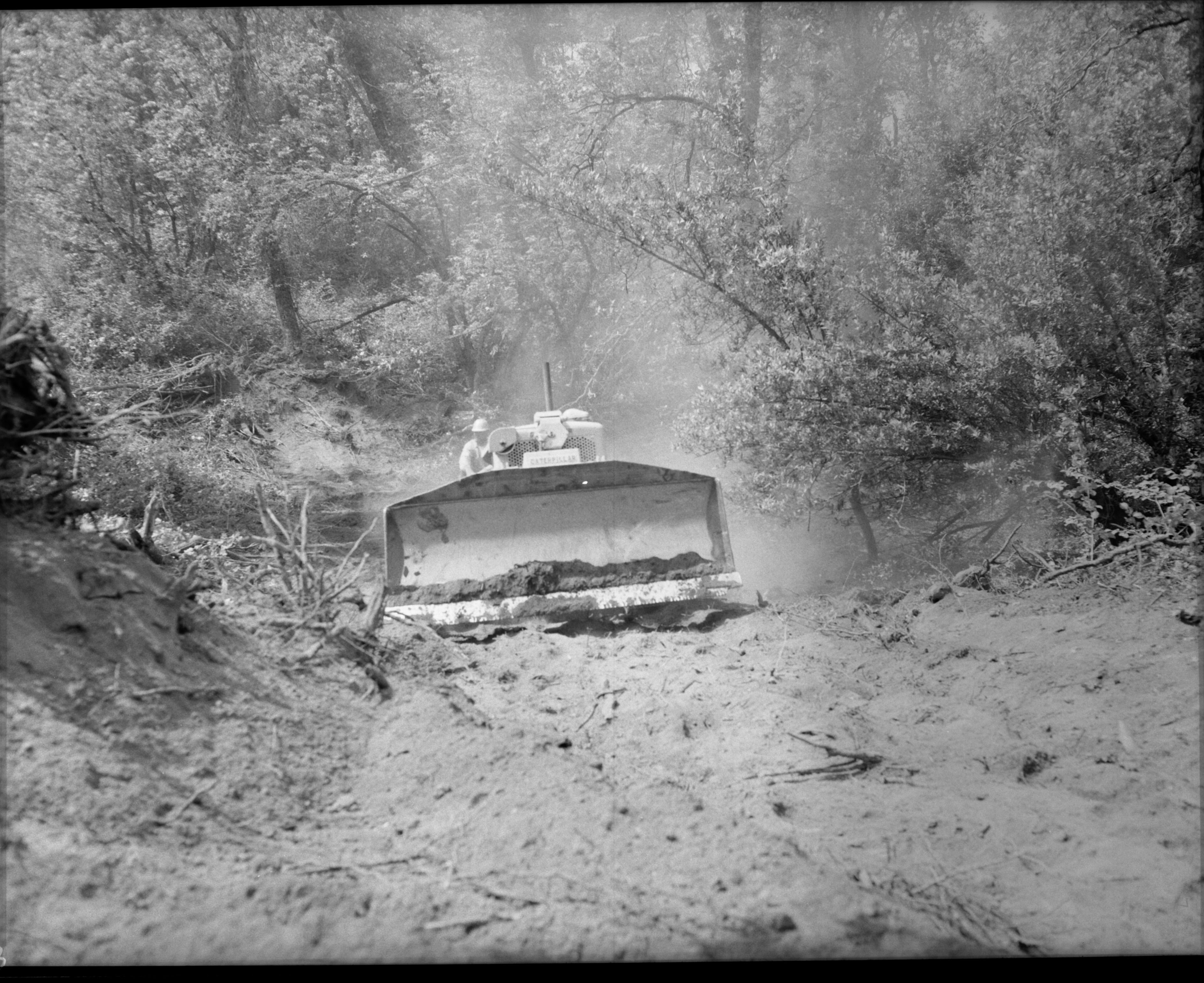 E.P. Menning, Ash Peak Ridge, SNP, Wildland Fires, Bulldozer clearing fireline in Tunnel Rock Fire. Vehicles and equipment. 600629.