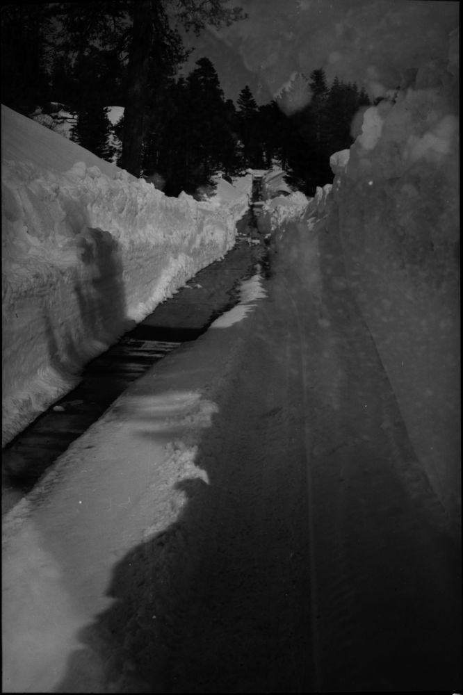 Robert Zink, Generals Highway between the Wye and Kings Canyon Overlook, Record Heavy Snow, One lane cleared near Big Baldy. 630322.