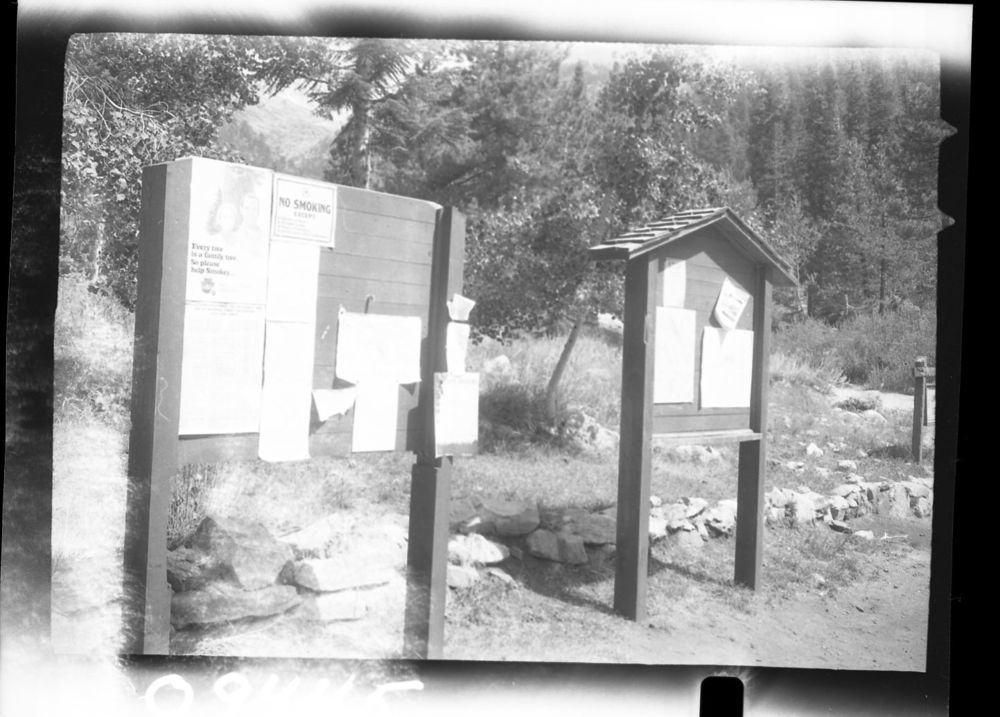 P.J. Wyckoff, 690911, Mineral King Valley, SNP, Signs, Forest Service Bulletin board with Sierra Club "Stop Mineral King" petition.