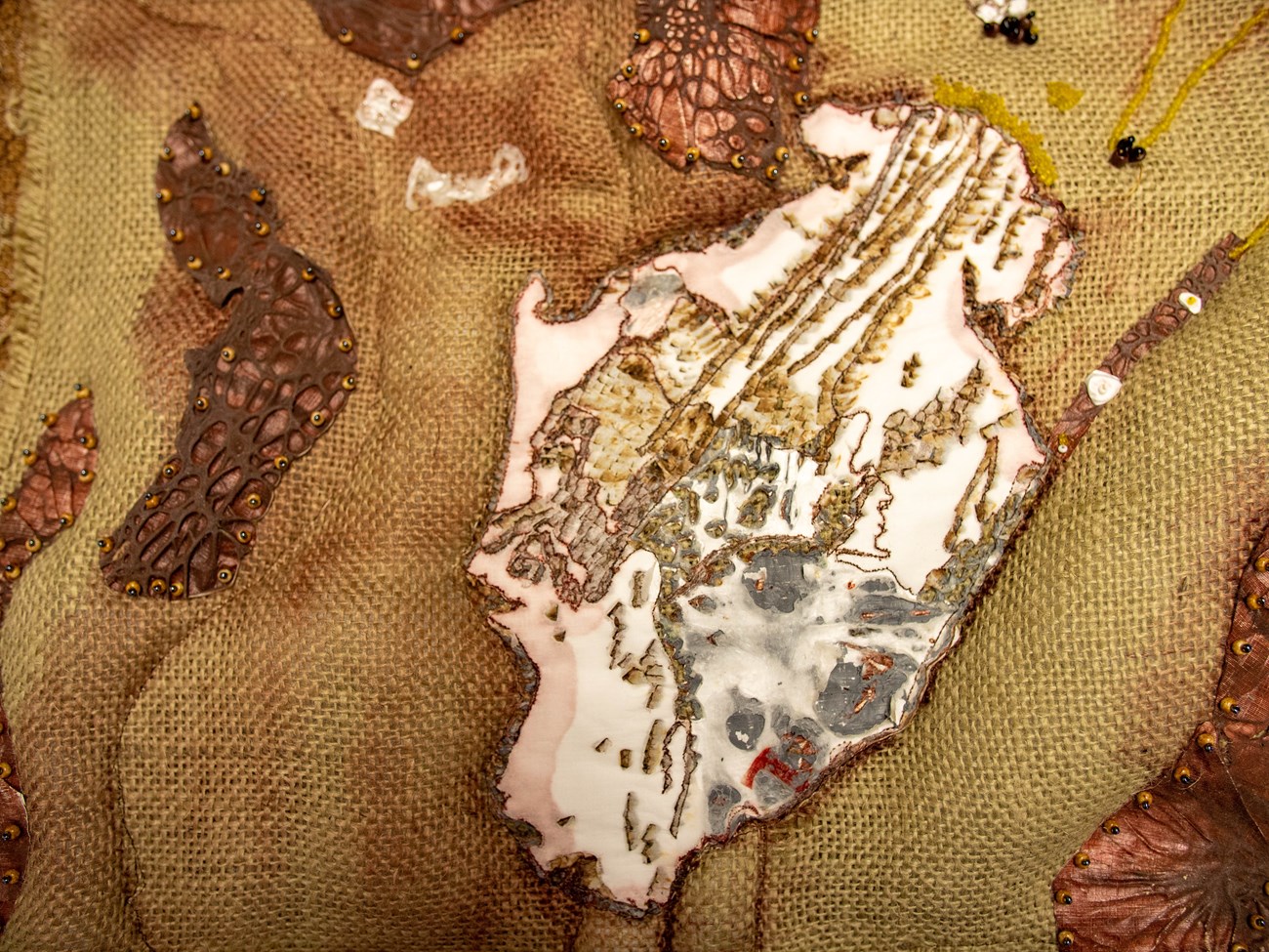 "This memorial piece was created with hand and commercial dyed burlap, variegated thread, beads, fabric paint, sharpie, alcohol, Tyvek, heat and time. "The melted blue Tyvek frame represents the loss of blue. No more glaciers, no more glacial blue. "Thanks to Bill Baccus for being the glacial memory of Olympic National Park." -Diane Williams