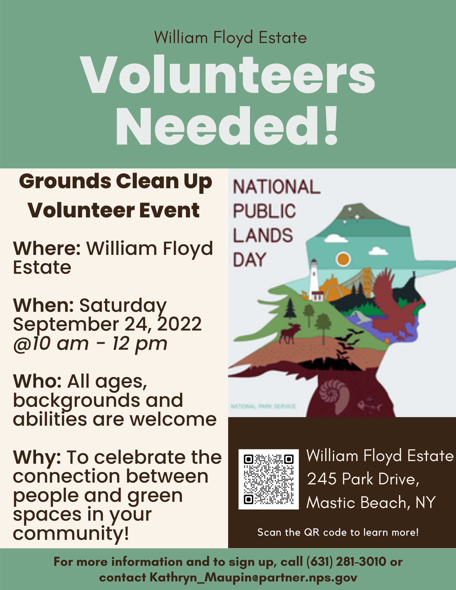 The historic William Floyd Estate can use your help! Join Fire Island National Seashore in volunteering for the William Floyd Estate Grounds Clean Up Event to celebrate National Public Lands Day. Held annually on the fourth Saturday of September, National Public Lands Day is the nation's largest single-day volunteer effort. This day encourages people to connect with greenspaces in their community to inspire stewardship and the use of open space for education and recreation. The William Floyd Estate represents 300 years of history, so let's make the best of it by volunteering to keep this historic site in the present!