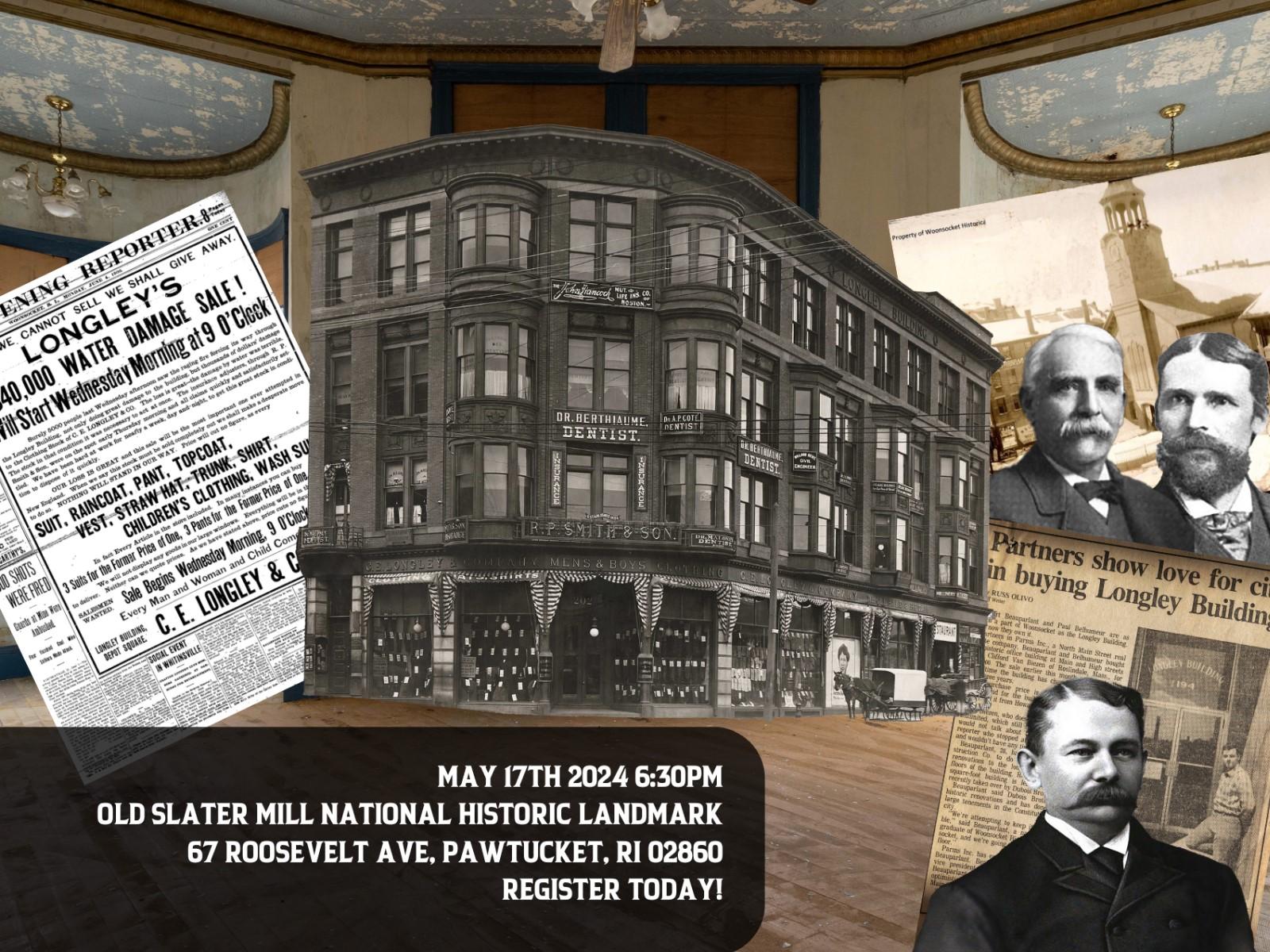 This Preservation Month, learn the history of the legendary Longley Building, a Woonsocket landmark built in 1890. Named for Charles E. Longley, this structure is part of the Main Street District of Woonsocket, an area listed on the National Register of Historic Places. For more than a century, dozens of business owners have had a premier view of Woonsocket's Main Street from inside the Longley Building. Hear their stories and get a new perspective on history in Providence, Pawtucket, and Woonsocket.