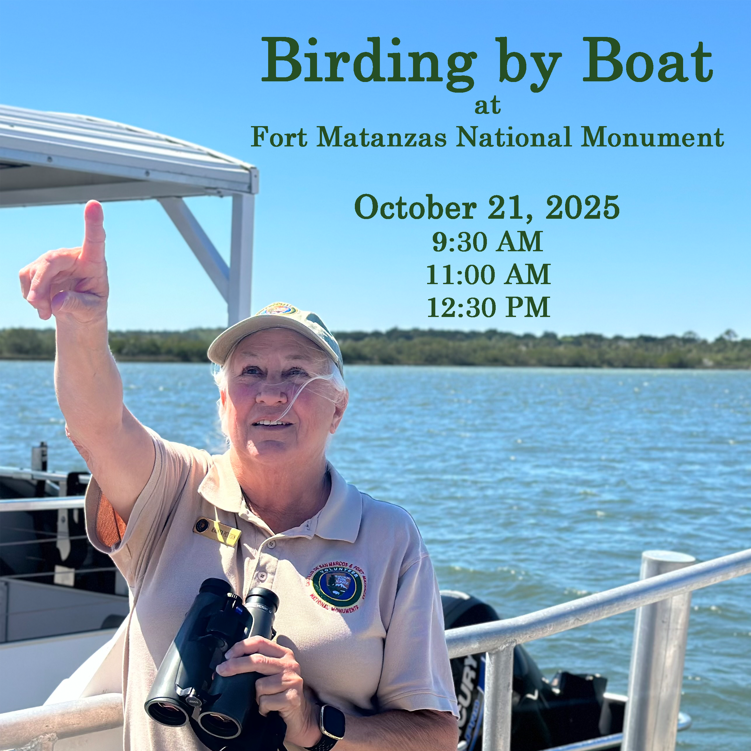 Birding by Boat will take place on Tuesday, October 21, 2025. Three cruises will be offered: 9:30 AM, 11:00 AM, and 12:30 PM. It is strongly recommended that participants bring a water bottle, sunscreen, bug spray, closed-toed shoes, a hat, and sunglasses. Binoculars will be available to borrow as supplies last.