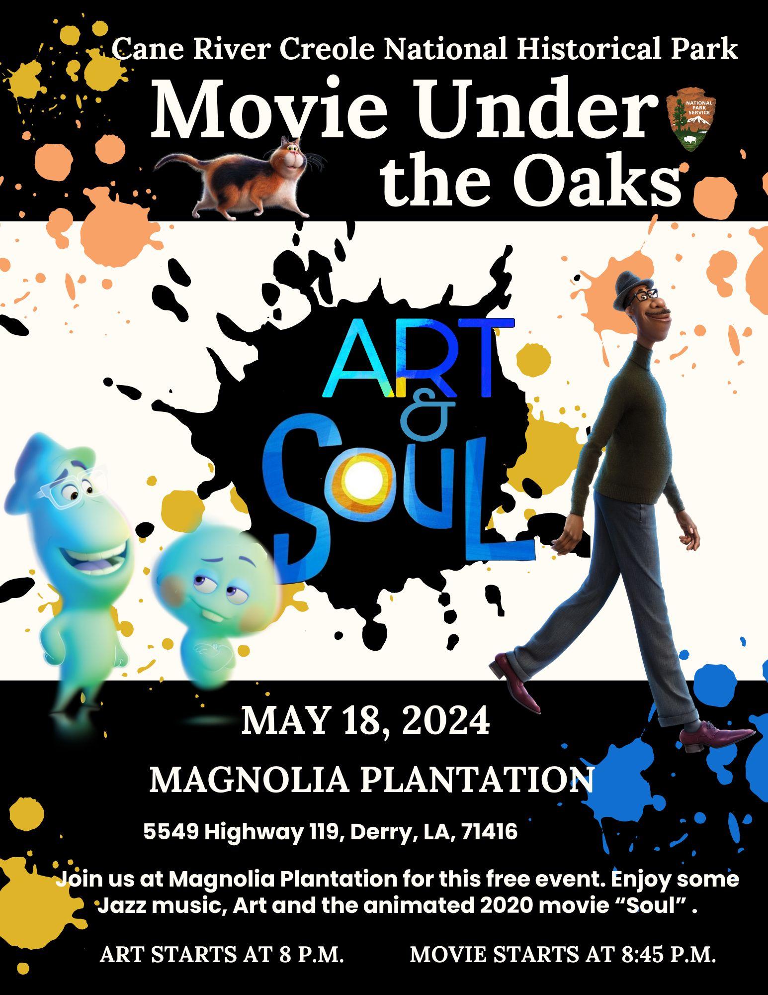 Come be inspired by the sounds of Louisiana music and paint! Then relax and watch the 2020 film, Soul, with us at Magnolia Plantation. Music and painting at 8:00 pm. Movie at 8:45 pm. Registration is preferred for the art portion. To register email danira_mcclary@nps.gov.