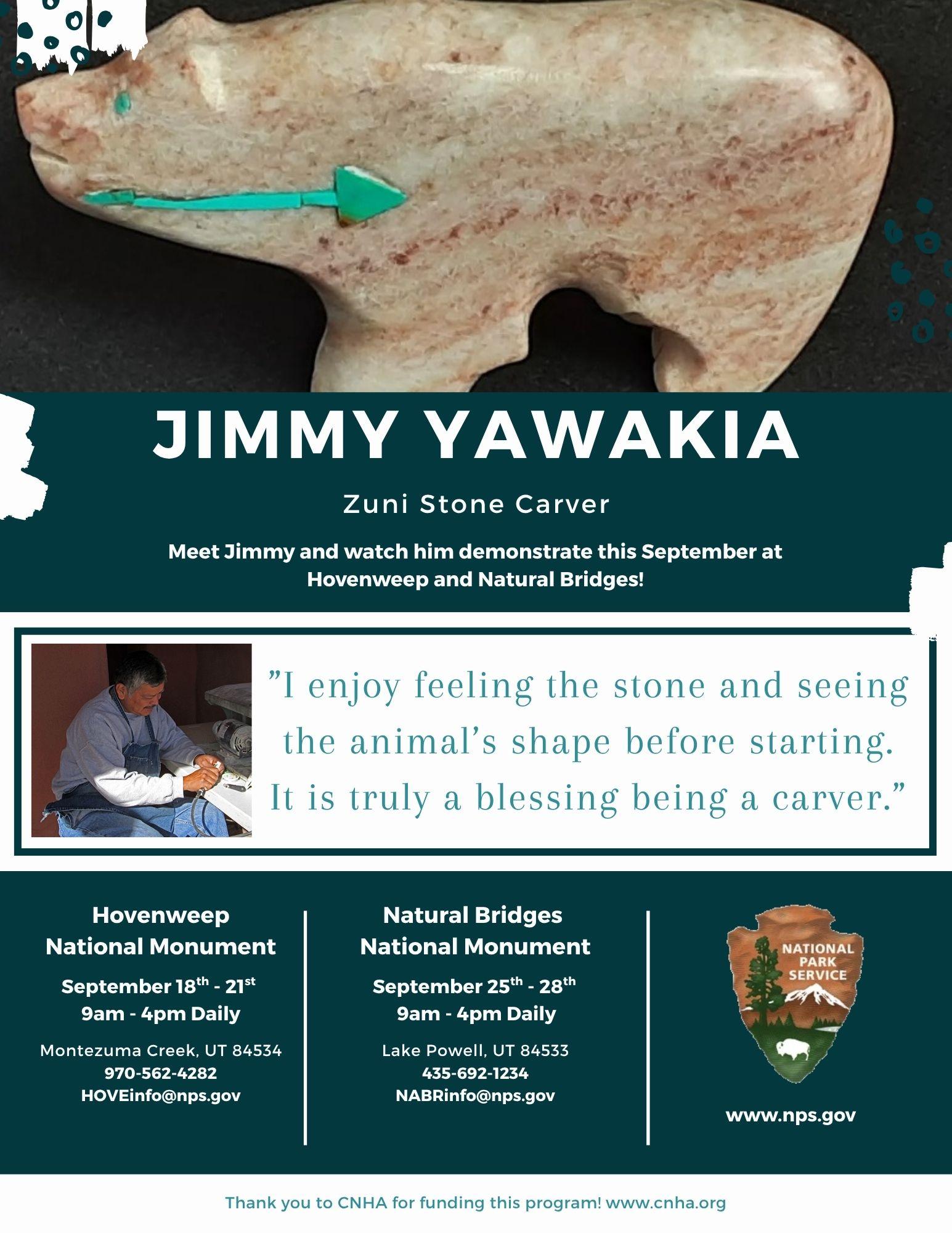 September 18th - 21st, visitors will have the opportunity to meet Jimmy Yawakia, a Zuni stone carver, and watch him carve effigies and engage with the public if they have questions. Here's more about Jimmy in his own words: