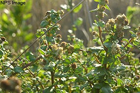 Blue Blossom (Ceanothus thyrsiflorus)Blue Blossom resembles a lilac. Spring finds clusters of blue flowers sticking out from the branches. Unlike a lilac, blue blossom’s dark green leaves stay on the branches year-round. Each leaf has three prominent veins that connect the base to the tip. The best places to view blue blossom are off Limantour Road, Bayview Trail, Drakes View Trail, and Muddy Hollow Road. |