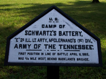 Inscription Reads: U. S. Camp of SCHWARTZ'S BATTERY, "E", 2d ILL. LT. ARTY., McClernand's (1st) Div., ARMY OF THE TENNESSEE. First position in line of battle April 6, 1862, was 3/8 mile west, behind Buckland's brigade.